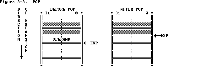 POP (Pop) transfers the word or doubleword at the current top of stack (indicated by ESP) to the destination operand, and then increments ESP to point to the new top of stack. See Figure 3-3. POP moves information from the stack to a general register, or to memory There are also a variant of POP that operates on segment registers. This is covered in a later section of this chapter.