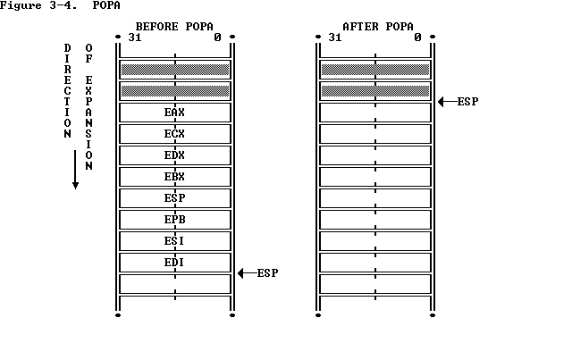 POPA (Pop All Registers) restores the registers saved on the stack by PUSHA, except that it ignores the saved value of ESP. See Figure 3-4.