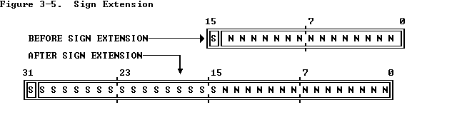 The type conversion instructions convert bytes into words, words into doublewords, and doublewords into 64-bit items (quad-words). These instructions are especially useful for converting signed integers, because they automatically fill the extra bits of the larger item with the value of the sign bit of the smaller item. This kind of conversion, illustrated by Figure 3-5, is called sign extension.