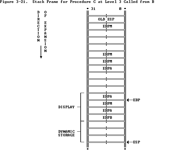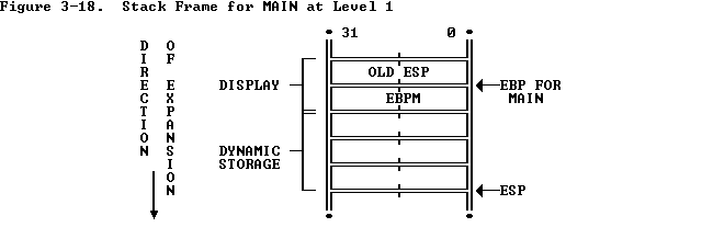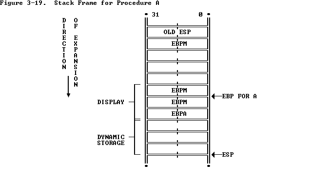 After MAIN calls PROCEDURE A, ENTER creates a new display for PROCEDURE A with the first word pointing to the previous value of EBP (BPM for LEAVE to return to the MAIN stack frame) and the second word pointing to the current value of EBP. Procedure A can access variables in MAIN since MAIN is at level 1. Therefore the base for the dynamic storage for MAIN is at [EBP-2]. All dynamic variables for MAIN are at a fixed offset from this value. See Figure 3-19 .