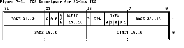 The BASE, LIMIT, and DPL fields and the G-bit and P-bit have functions similar to their counterparts in data-segment descriptors. The LIMIT field, however, must have a value equal to or greater than 103. An attempt to switch to a task whose TSS descriptor has a limit less that 103 causes an exception. A larger limit is permissible, and a larger limit is required if an I/O permission map is present. A larger limit may also be convenient for systems software if additional data is stored in the same segment as the TSS.