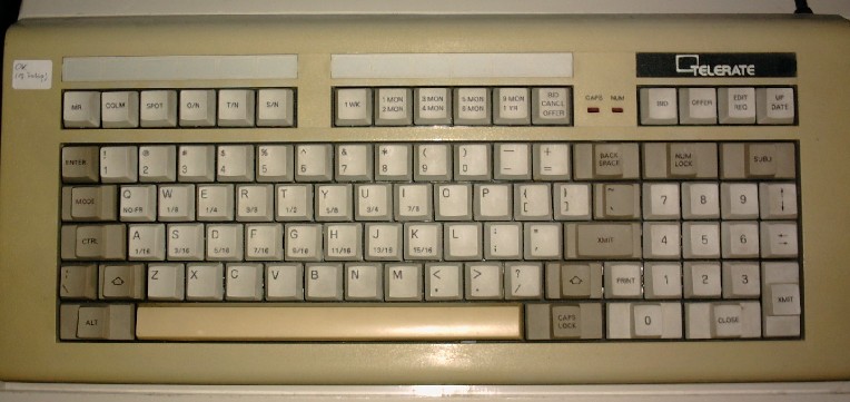 The Telerate keyboard was used for financial applications, as is clear from the keycaps. This keyboard (in the old XT version, without e0 prefixes) has four additional keys, with scancodes 61, 62, 63, 64. The F11 and F12 keys have scancodes 54 and 55 (instead of the common 57 and 58). There are two LEDs (for CapsLock and NumLock).