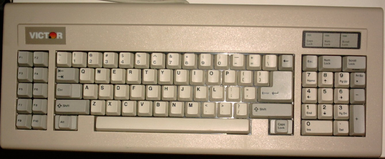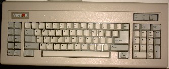This Victor keyboard is very similar. The keypad is separated here, and the Esc key has been moved to the keypad. The frontside of the ScrollLock key says Break. It resembles an AT keyboard but has only 83 keys, the SysRq is still missing.