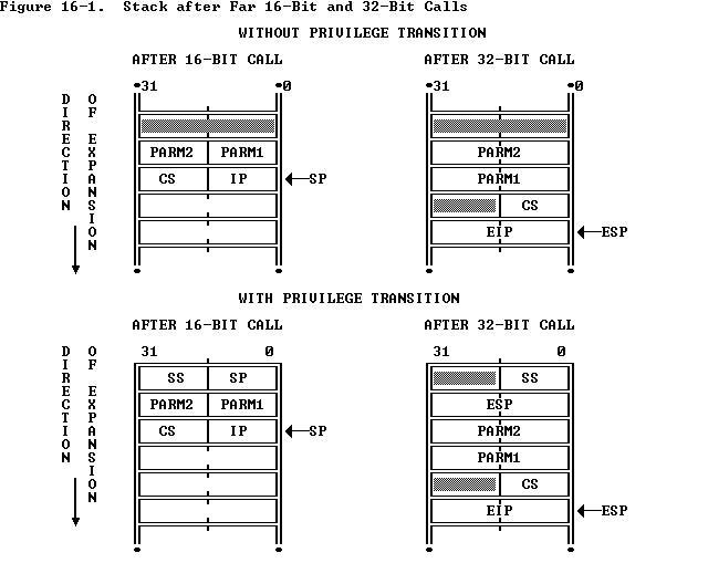 Because stack management is different for 16-bit CALL/RET than for 32-bit CALL/RET, the operand size of RET must match that of CALL. (Refer to Figure 16-1 .) A 16-bit CALL pushes the 16-bit IP and (for calls between privilege levels) the 16-bit SP register. The corresponding RET must also use a 16-bit operand size to POP these 16-bit values from the stack into the 16-bit registers. A 32-bit CALL pushes the 32-bit EIP and (for interlevel calls) the 32-bit ESP register. The corresponding RET must also use a 32-bit operand size to POP these 32-bit values from the stack into the 32-bit registers. If the two halves of a CALL/RET pair do not have matching operand sizes, the stack will not be managed correctly and the values of the instruction pointer and stack pointer will not be restored to correct values.