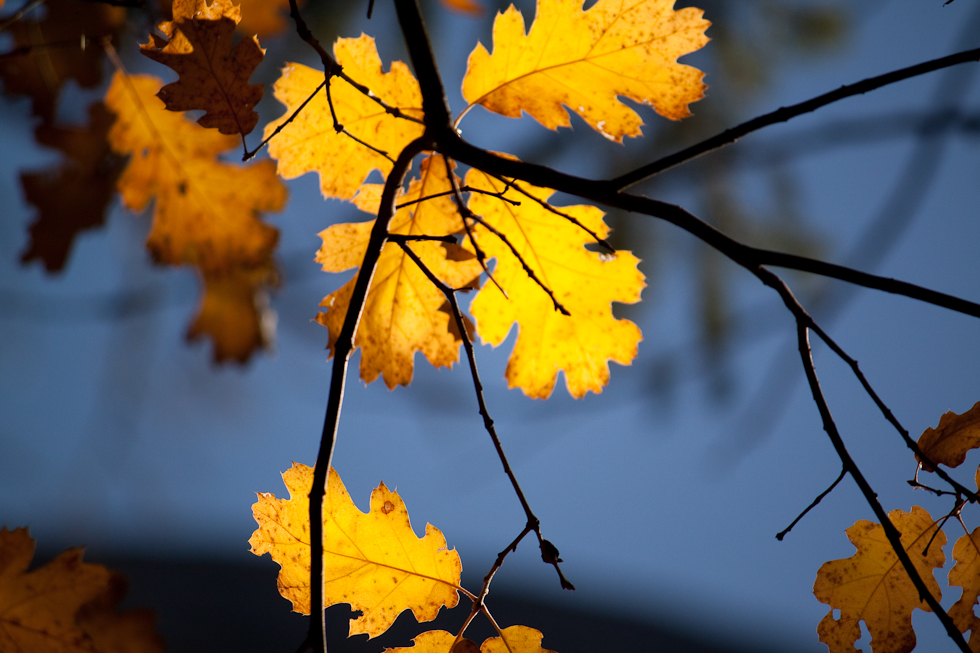 Unfortunately, the focus shifted to the leaves at the bottom. But I like the blue-yellow contrast in this picture. The leaves were lit by the sun.