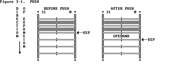 PUSH (Push) decrements the stack pointer (ESP), then transfers the source operand to the top of stack indicated by ESP (see Figure 3-1). PUSH is often used to place parameters on the stack before calling a procedure; it is also the basic means of storing temporary variables on the stack. The PUSH instruction operates on memory operands, immediate operands, and register operands (including segment registers).