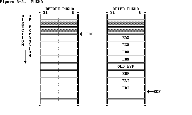 PUSHA (Push All Registers) saves the contents of the eight general registers on the stack (see Figure 3-2). This instruction simplifies procedure calls by reducing the number of instructions required to retain the contents of the general registers for use in a procedure. The processor pushes the general registers on the stack in the following order: EAX, ECX, EDX, EBX, the initial value of ESP before EAX was pushed, EBP, ESI, and EDI. PUSHA is complemented by the POPA instruction.