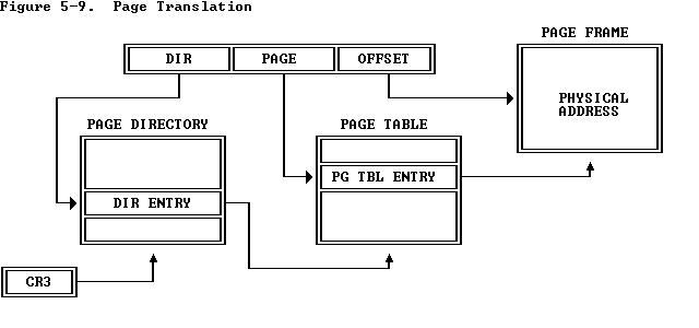 Figure 5-9 shows how the processor converts the DIR, PAGE, and OFFSET fields of a linear address into the physical address by consulting two levels of page tables. The addressing mechanism uses the DIR field as an index into a page directory, uses the PAGE field as an index into the page table determined by the page directory, and uses the OFFSET field to address a byte within the page determined by the page table.