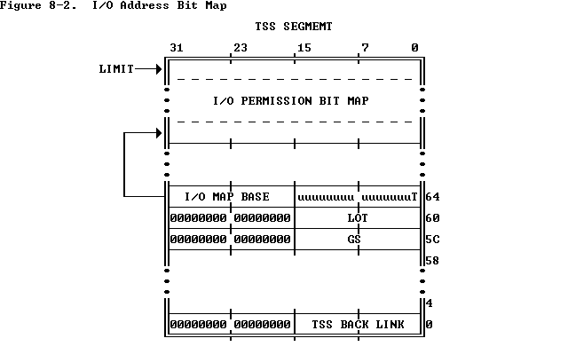 If I/O map base is greater than or equal to TSS limit, the TSS segment has no I/O permission map, and all I/O instructions in the 80386 program cause exceptions when CPL > IOPL.
