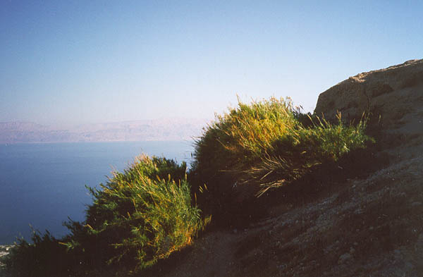 Sunlight striking bushes, overlooking the Dead Sea